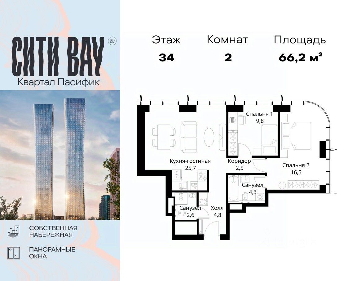 Продаётся 2-комнатная квартира общей площадью 66.20 м² без отделки в ЖК Сити Бэй, квартале Пасифик, на 34-м этаже 59 этажного дома.