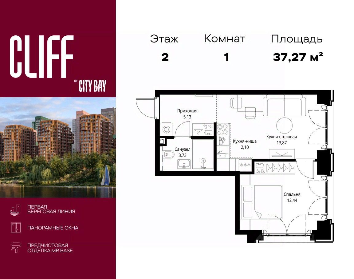 Продаётся 1-комнатная квартира общей площадью 37.27 м² с предчистовой отделкой в ЖК City Вау, квартале Cliff, на 2-м этаже 15 этажного дома.