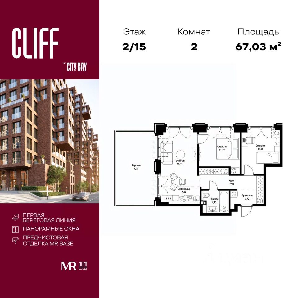 Продаётся 2-к квартира общей площадью 67.03 м² с предчистовой отделкой в ЖК City Вау, квартале Cliff, на 2-м этаже 15 этажного дома.