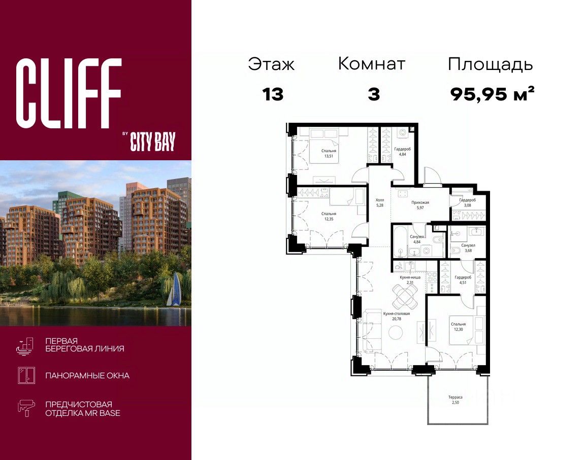 Продаётся 3-комнатная квартира общей площадью 95.95 м² с предчистовой отделкой в ЖК City Вау, квартале Cliff, на 13-м этаже 15 этажного дома.