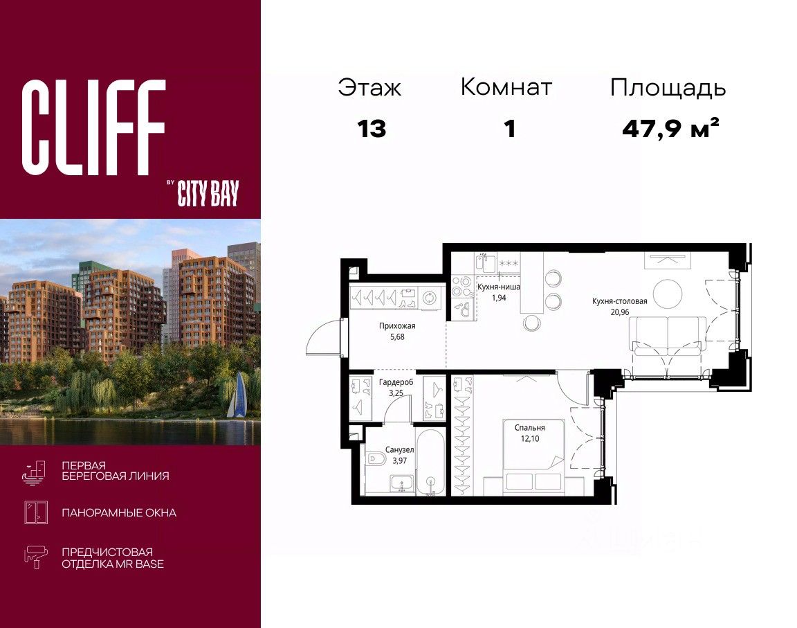 Продаётся 1-комнатная квартира общей площадью 47.90 м² с предчистовой отделкой в ЖК Сити Бэй, квартале Cliff, на 13-м этаже 15 этажного дома.