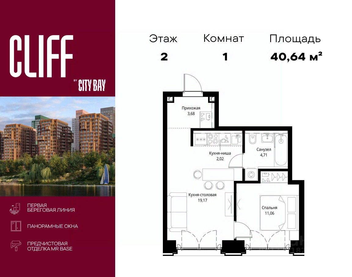 Продаётся 1-комнатная квартира общей площадью 40.64 м² с предчистовой отделкой в ЖК City Вау, квартале Cliff, на 2-м этаже 15 этажного дома.