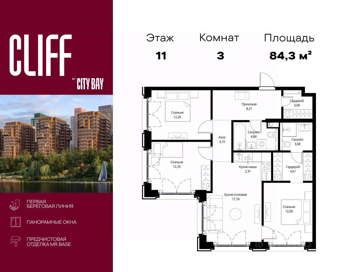 Продаётся 3-комнатная квартира общей площадью 84.30 м² с предчистовой отделкой в ЖК Сити Бэй, квартале Cliff, на 11-м этаже 15 этажного дома.