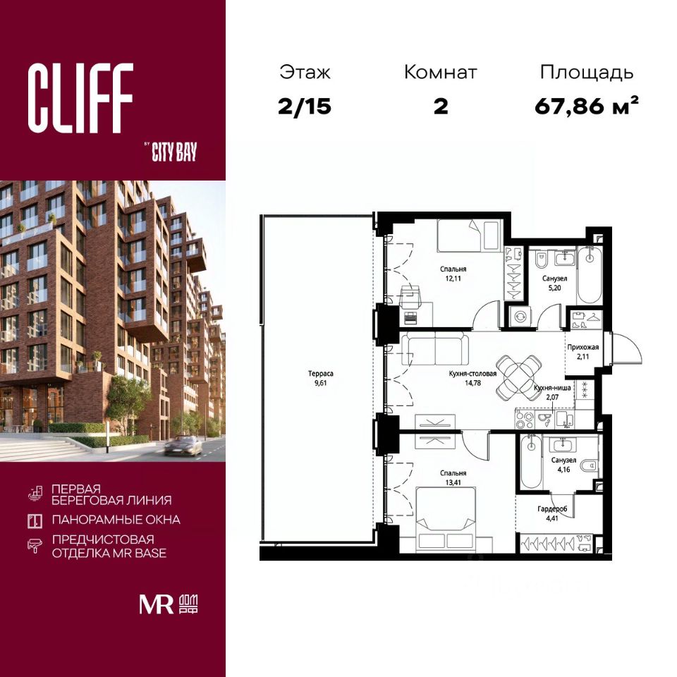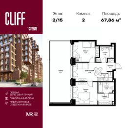 Продаётся 2-к квартира общей площадью 67.86 м² с предчистовой отделкой в ЖК City Вау, квартале Cliff, на 2-м этаже 15 этажного дома.
