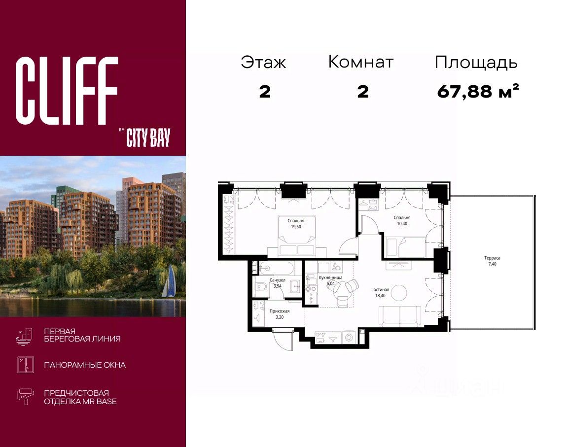 Продаётся 2-комнатная квартира общей площадью 67.88 м² с предчистовой отделкой в ЖК City Вау, квартале Cliff, на 2-м этаже 15 этажного дома.