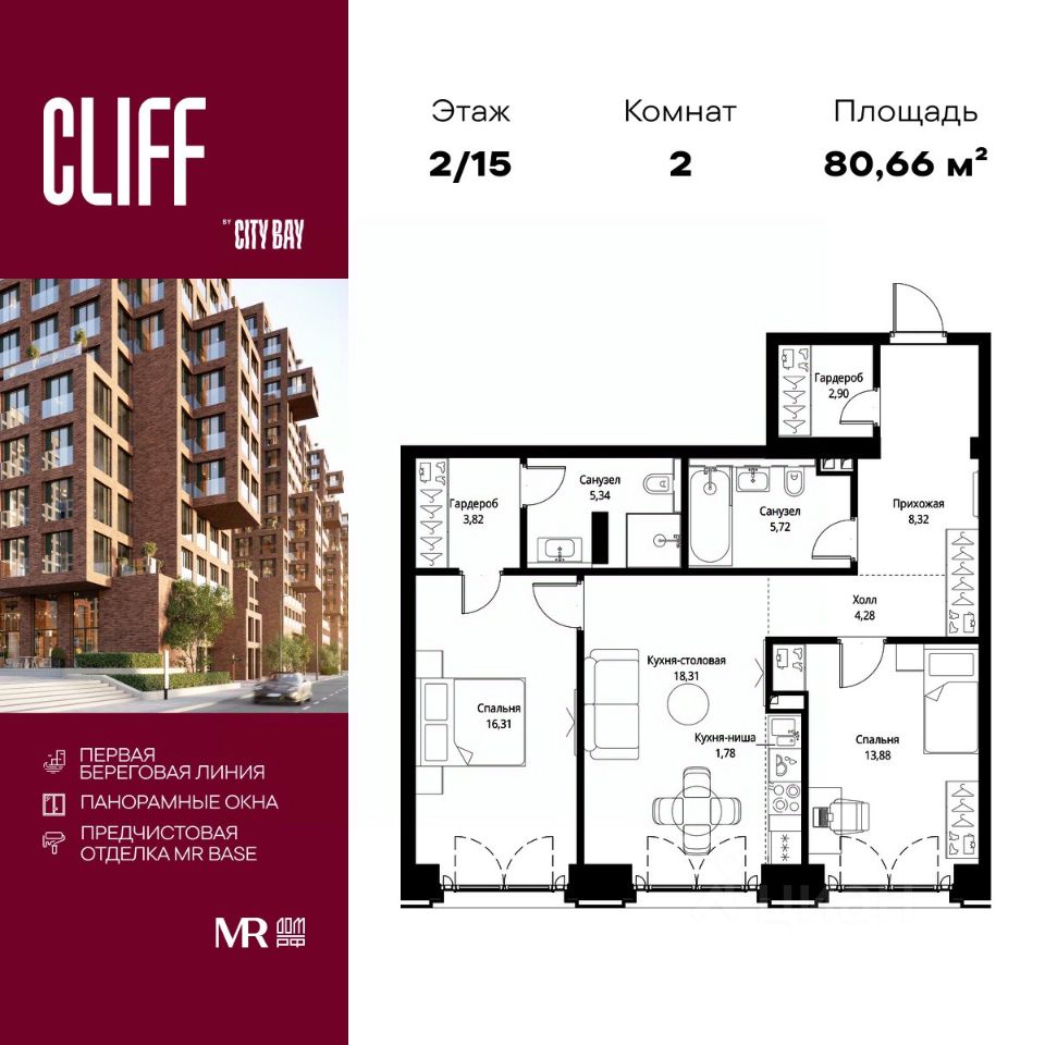 Продаётся 2-к квартира общей площадью 80.66 м² с предчистовой отделкой в ЖК City Вау, квартале Cliff, на 2-м этаже 15 этажного дома.