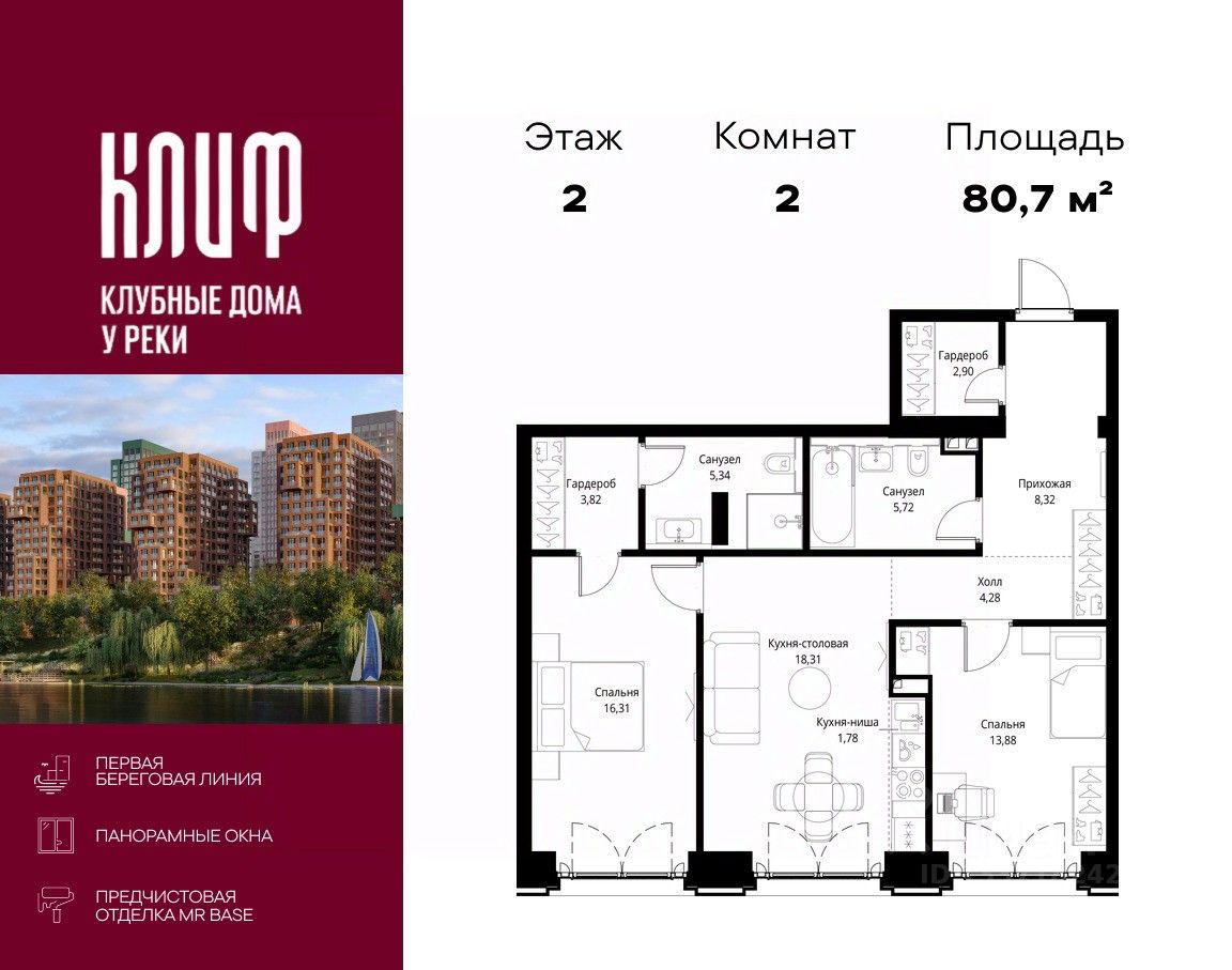 Продаётся 2-комнатная квартира общей площадью 80.66 м² с предчистовой отделкой в ЖК Сити Бэй, квартале Клиф, на 2-м этаже 15 этажного дома.