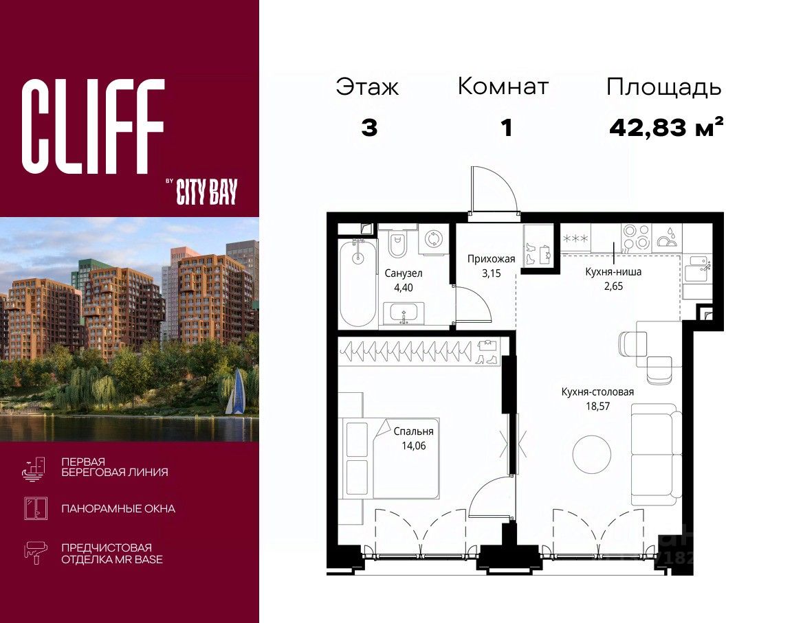 Продаётся 1-комнатная квартира общей площадью 42.83 м² с предчистовой отделкой в ЖК City Вау, квартале Cliff, на 3-м этаже 15 этажного дома.