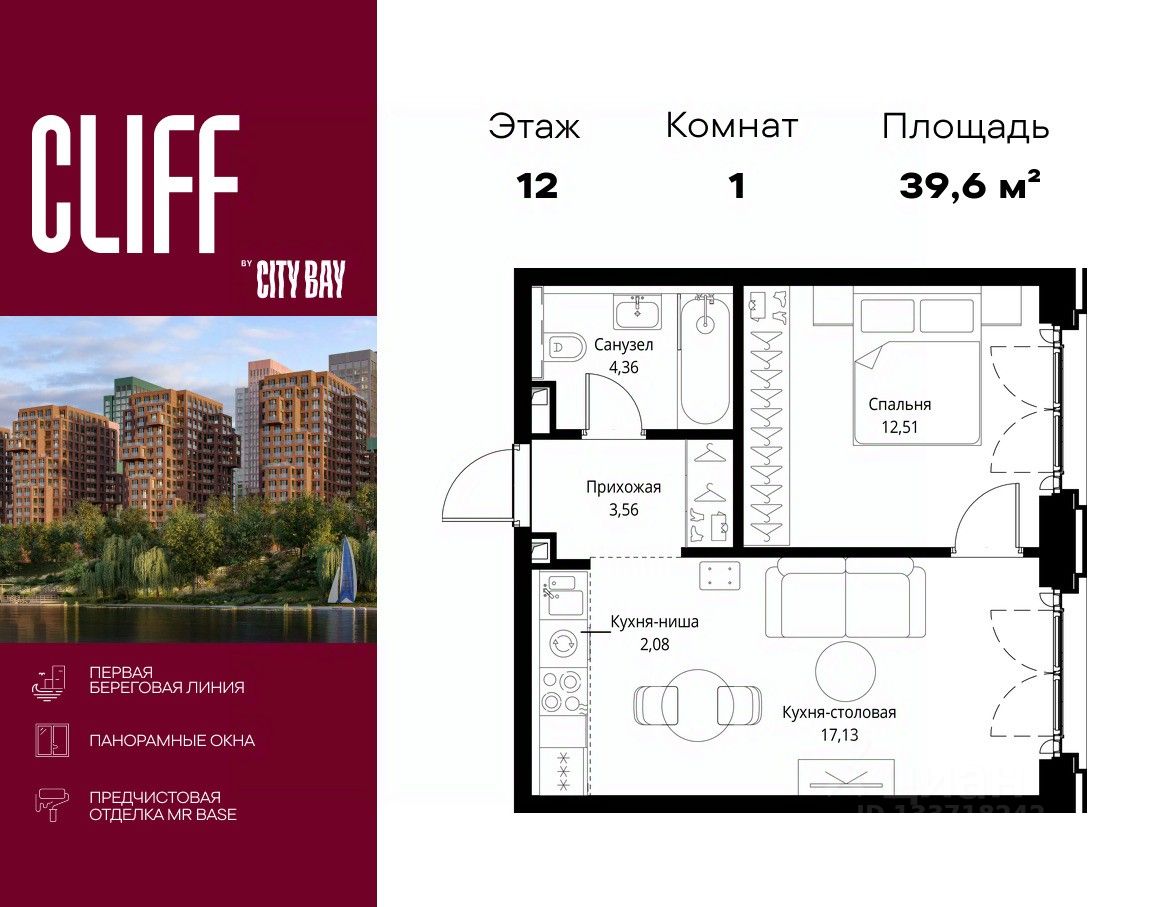 Продаётся 1-комнатная квартира общей площадью 39.64 м² с предчистовой отделкой в ЖК Сити Бэй, квартале Клиф, на 12-м этаже 15 этажного дома.