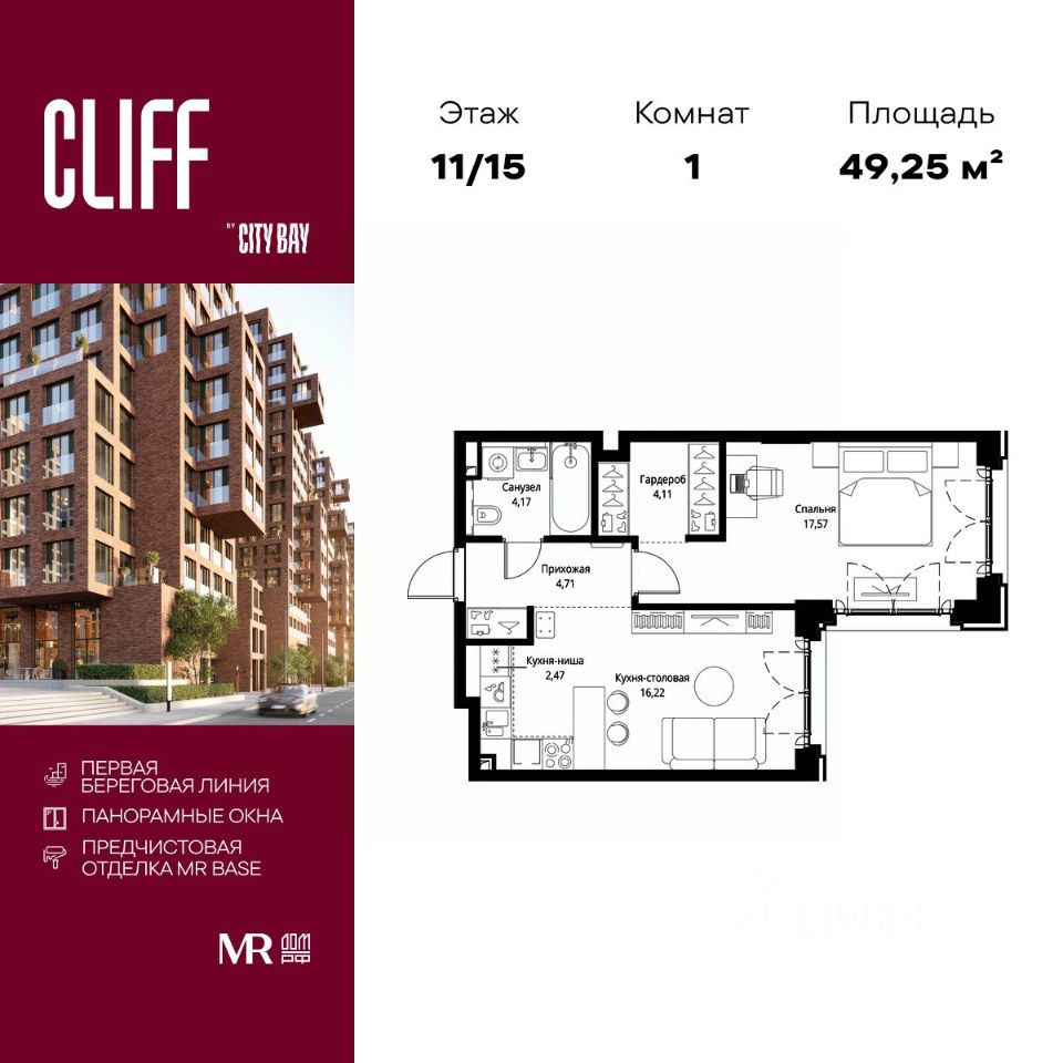 Продаётся 1-к квартира общей площадью 49.25 м² с предчистовой отделкой в ЖК City Вау, квартале Cliff, на 11-м этаже 15 этажного дома.