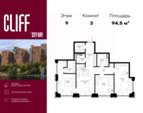 Продаётся 3-комнатная квартира общей площадью 94.47 м² с предчистовой отделкой в ЖК Сити Бэй, квартале Cliff, на 9-м этаже 15 этажного дома.