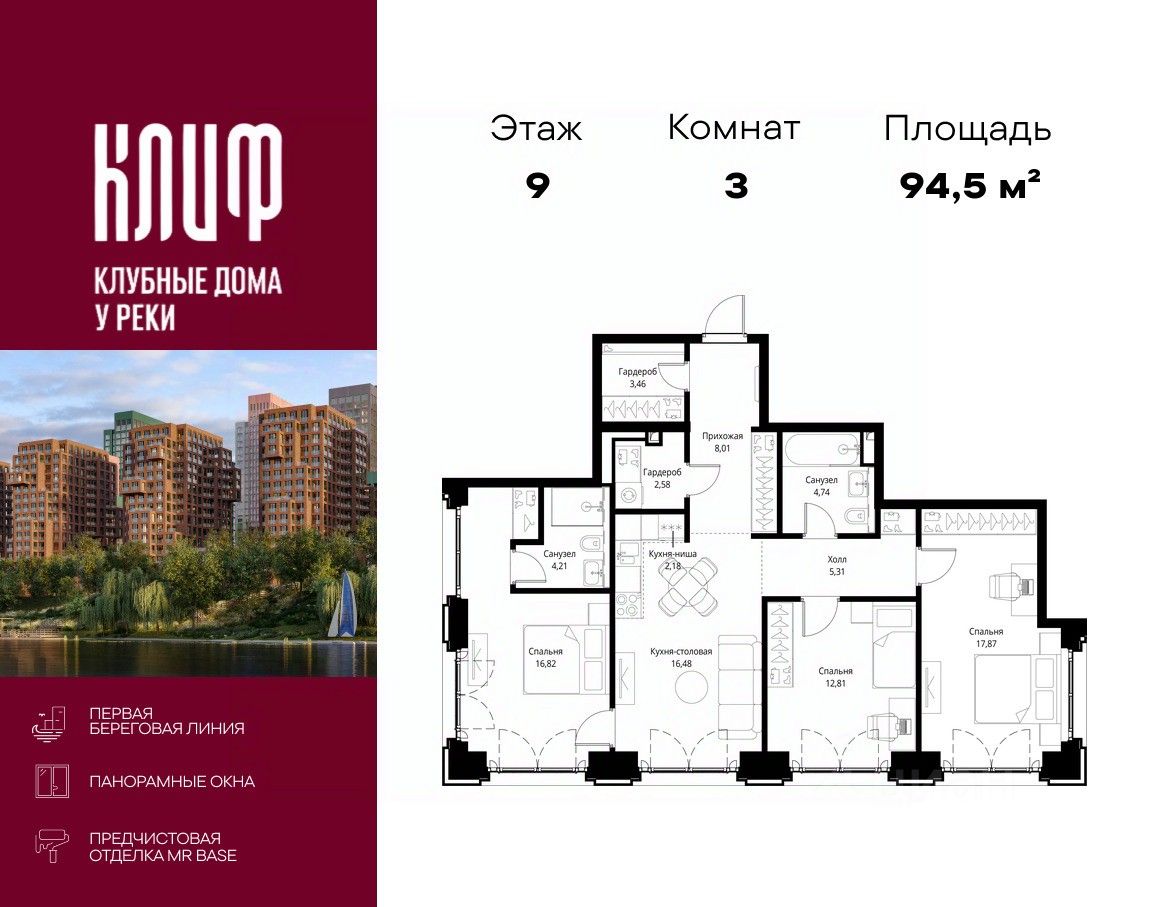 Продаётся 3-комнатная квартира общей площадью 94.47 м² с предчистовой отделкой в ЖК Сити Бэй, квартале Клиф, на 9-м этаже 15 этажного дома.