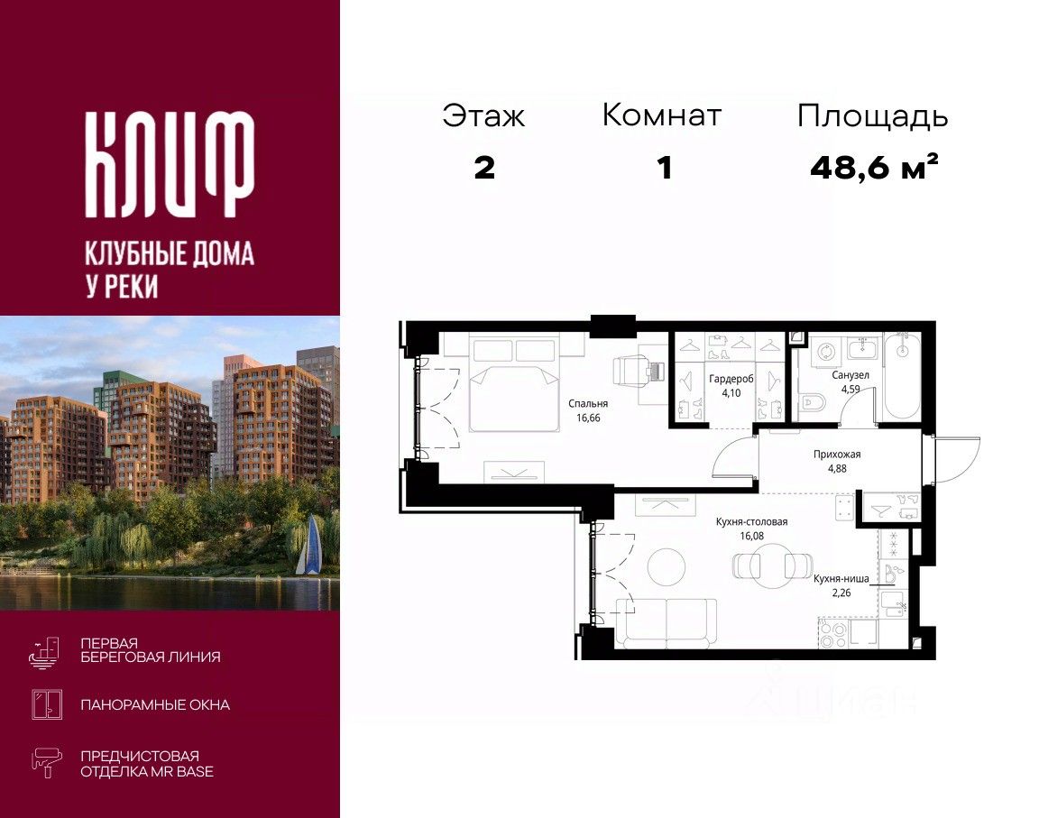 Продаётся 1-комнатная квартира общей площадью 48.57 м² с предчистовой отделкой в ЖК Сити Бэй, квартале Клиф, на 2-м этаже 15 этажного дома.