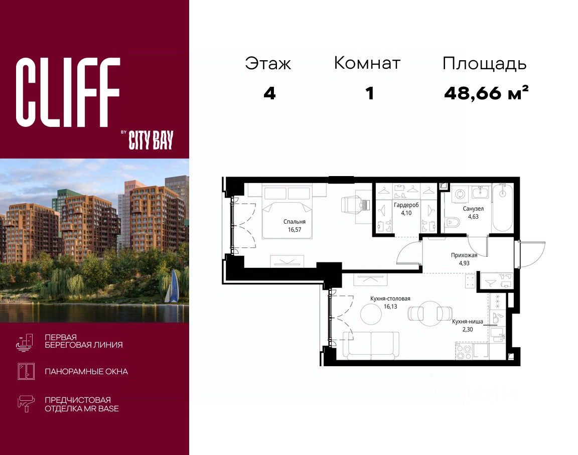 Продаётся 1-комнатная квартира общей площадью 48.66 м² с предчистовой отделкой в ЖК City Вау, квартале Cliff, на 4-м этаже 15 этажного дома.