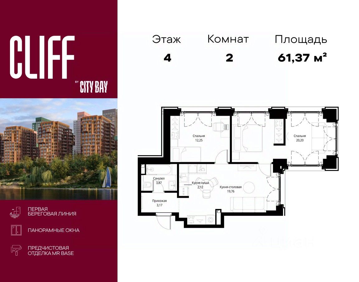 Продаётся 2-комнатная квартира общей площадью 61.37 м² с предчистовой отделкой в ЖК City Вау, квартале Cliff, на 4-м этаже 15 этажного дома.