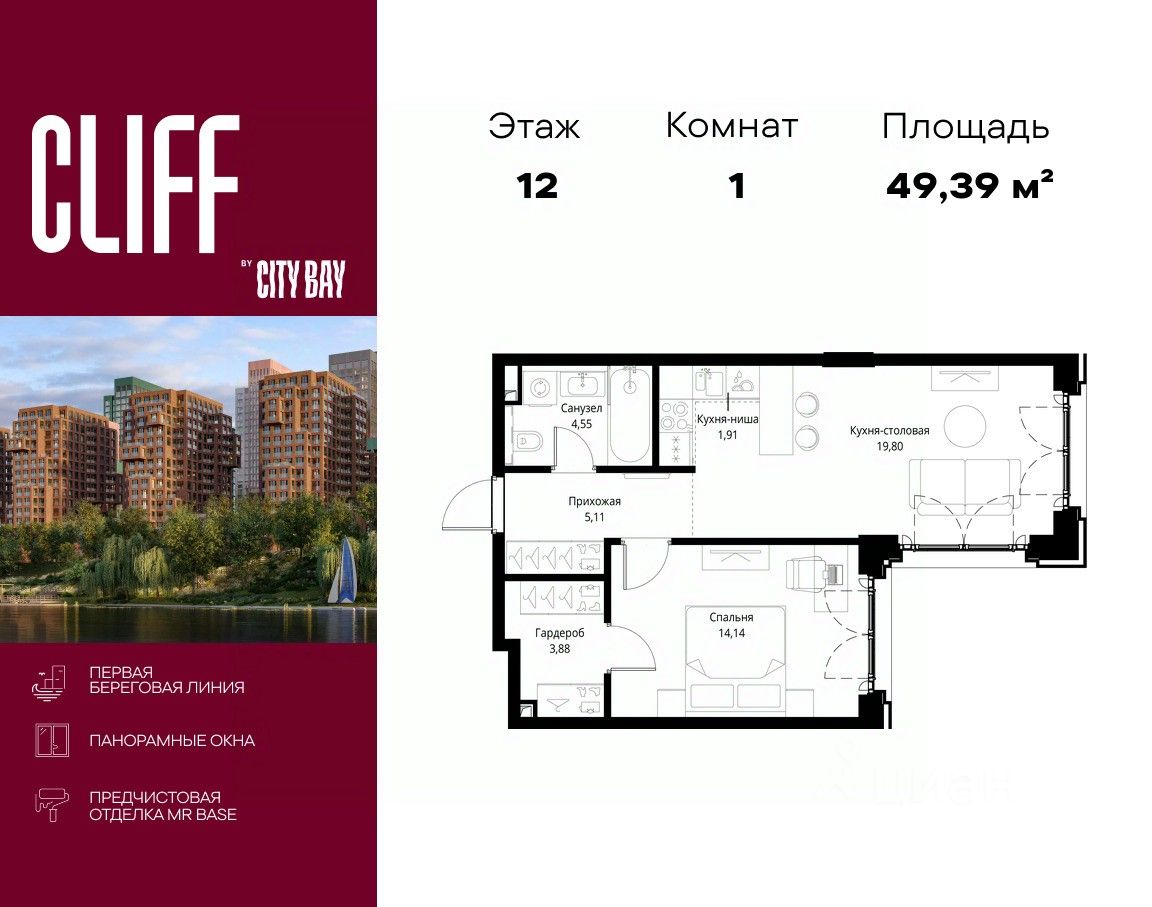 Продаётся 1-комнатная квартира общей площадью 49.39 м² с предчистовой отделкой в ЖК City Вау, квартале Cliff, на 12-м этаже 15 этажного дома.
