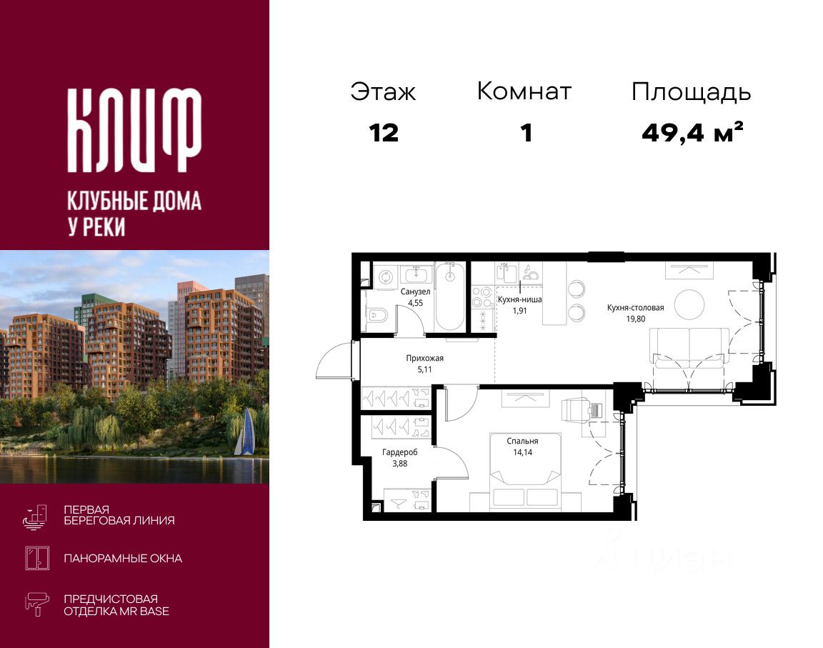 Продаётся 1-комнатная квартира общей площадью 49.39 м² с предчистовой отделкой в ЖК Сити Бэй, квартале Клиф, на 12-м этаже 15 этажного дома.