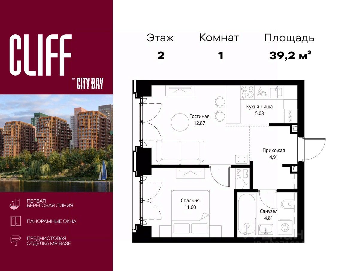 Продаётся 1-комнатная квартира общей площадью 39.22 м² с предчистовой отделкой в ЖК Сити Бэй, квартале Cliff, на 2-м этаже 15 этажного дома.