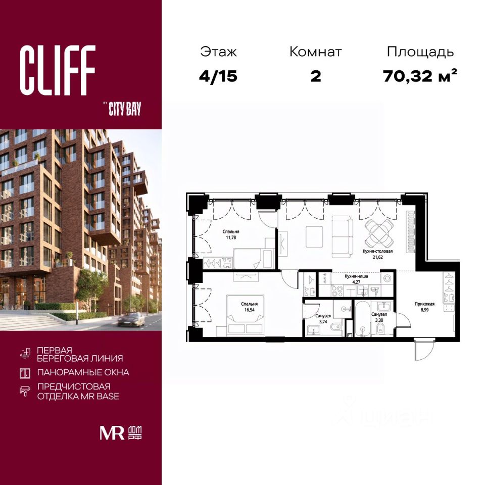 Продаётся 2-к квартира общей площадью 70.32 м² с предчистовой отделкой в ЖК City Вау, квартале Cliff, на 4-м этаже 15 этажного дома.