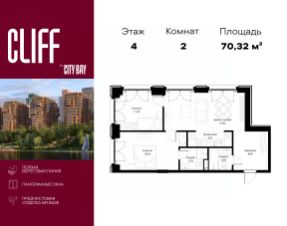 Продаётся 2-комнатная квартира общей площадью 70.32 м² с предчистовой отделкой в ЖК City Вау, квартале Cliff, на 4-м этаже 15 этажного дома.