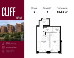 Продаётся 1-комнатная квартира общей площадью 53.55 м² с предчистовой отделкой в ЖК City Вау, квартале Cliff, на 2-м этаже 15 этажного дома.