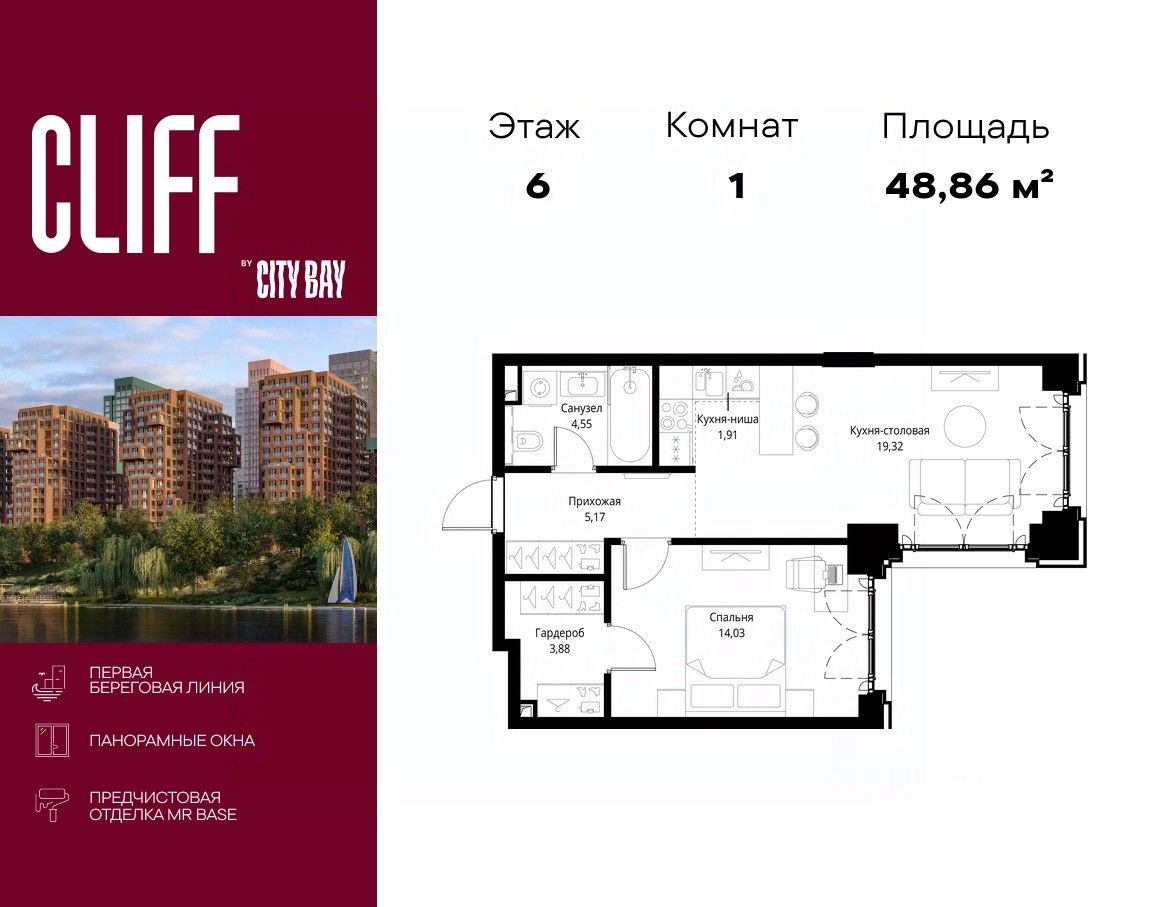 Продаётся 1-комнатная квартира общей площадью 48.86 м² с предчистовой отделкой в ЖК City Вау, квартале Cliff, на 6-м этаже 15 этажного дома.