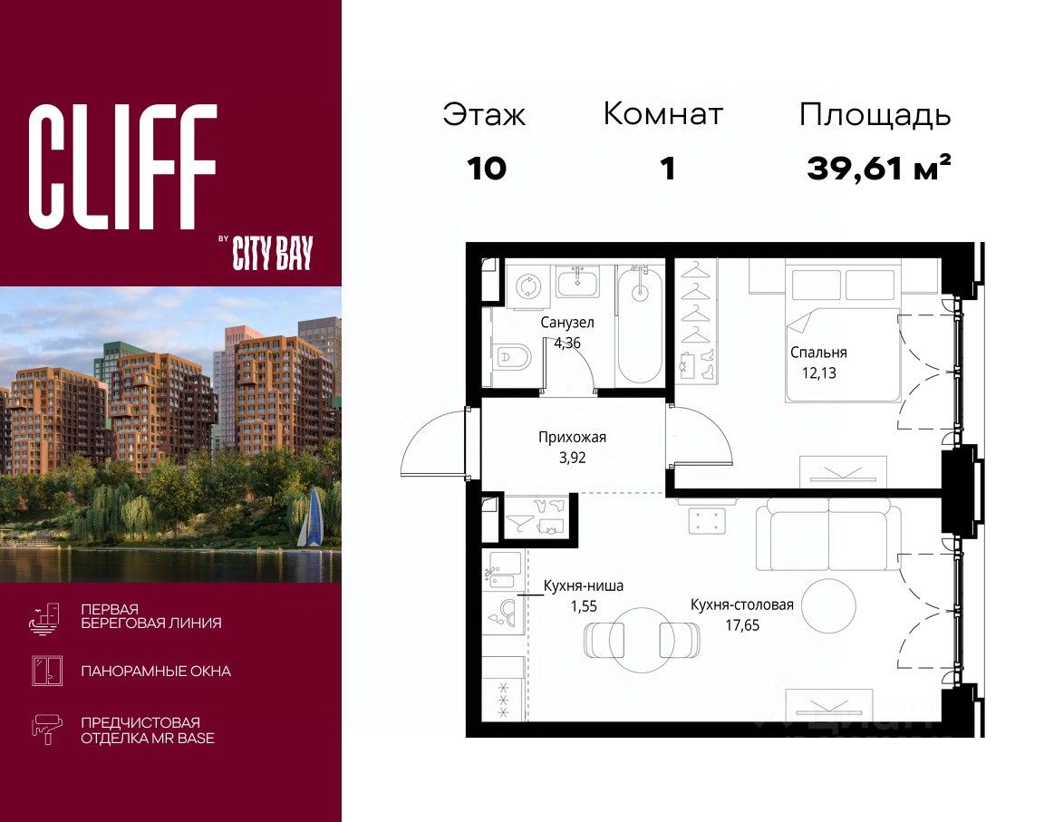 Продаётся 1-комнатная квартира общей площадью 39.61 м² с предчистовой отделкой в ЖК City Вау, квартале Cliff, на 10-м этаже 15 этажного дома.