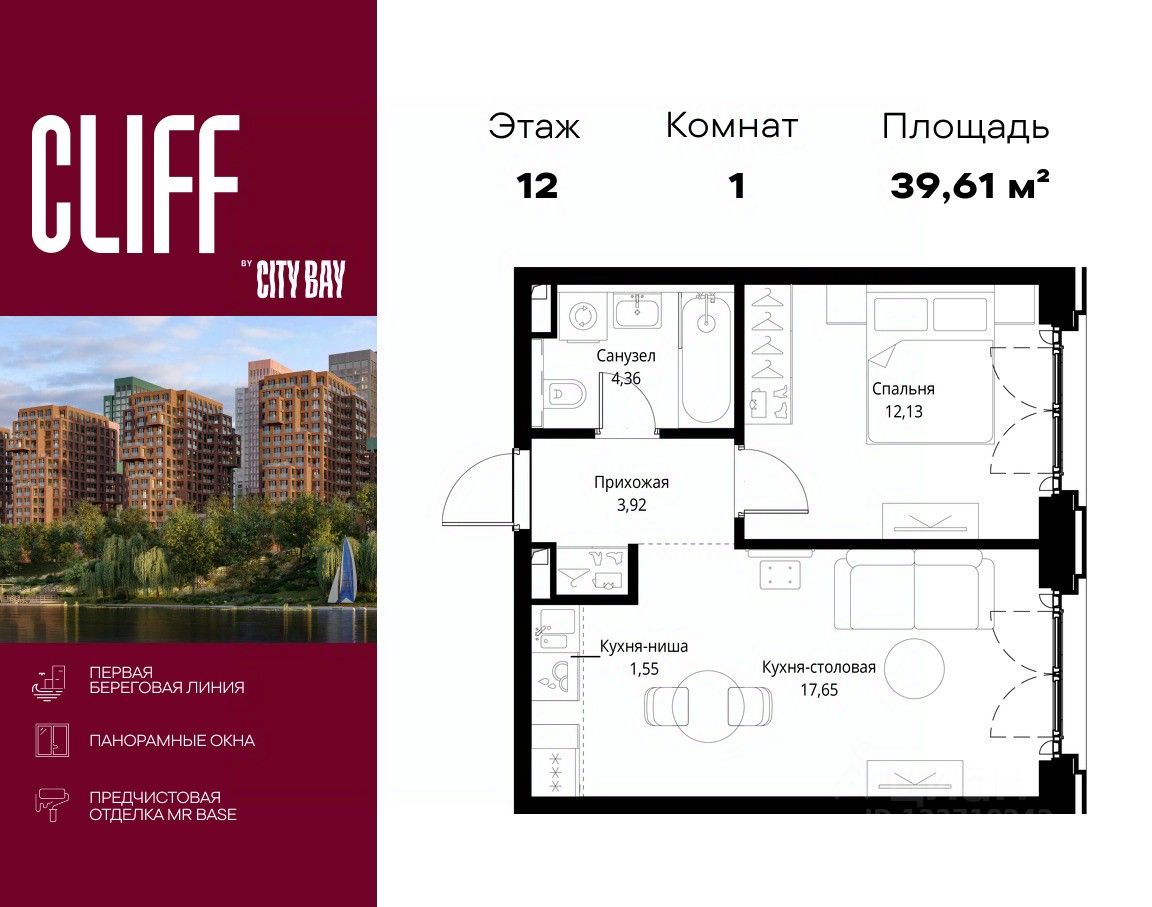 Продаётся 1-комнатная квартира общей площадью 39.61 м² с предчистовой отделкой в ЖК City Вау, квартале Cliff, на 12-м этаже 15 этажного дома.