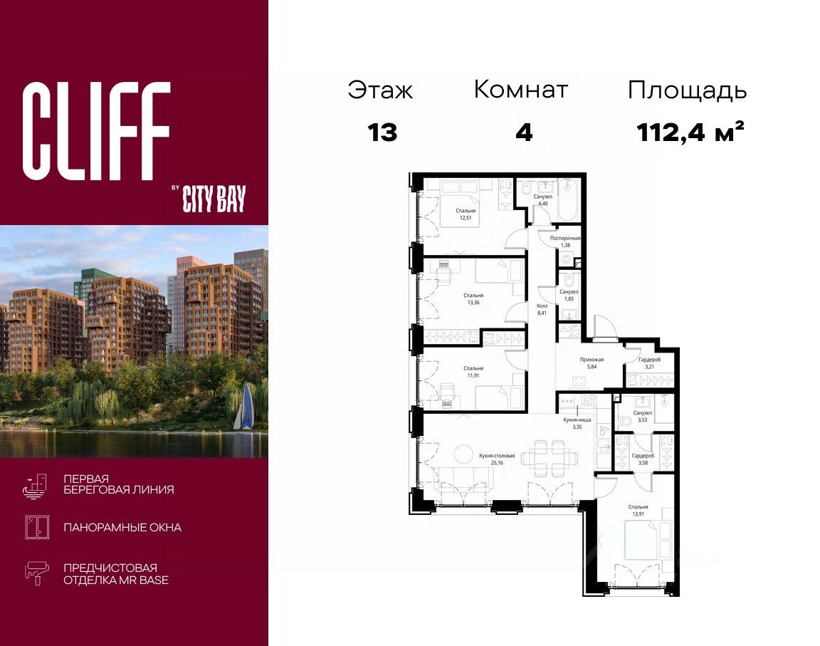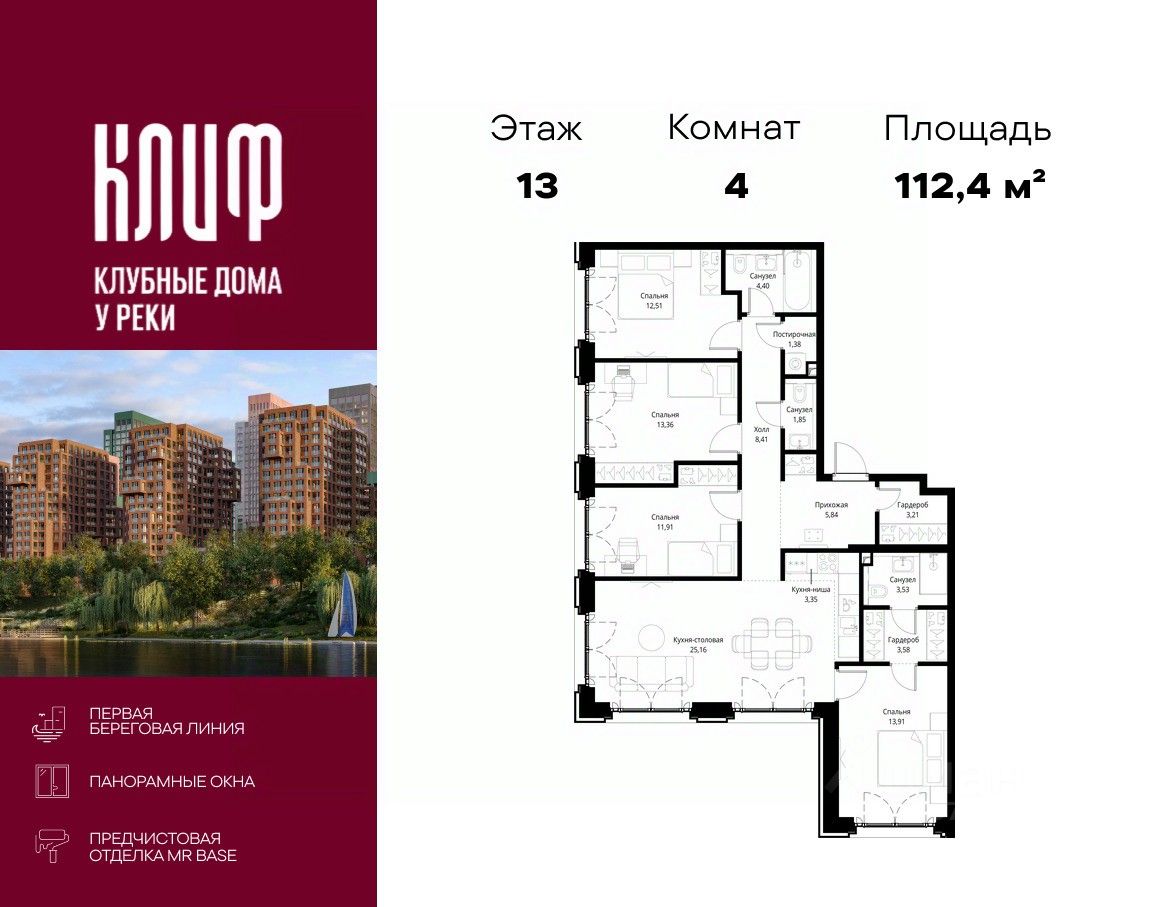 Продаётся 4-комнатная квартира общей площадью 112.40 м² с предчистовой отделкой в ЖК Сити Бэй, квартале Клиф, на 13-м этаже 15 этажного дома.