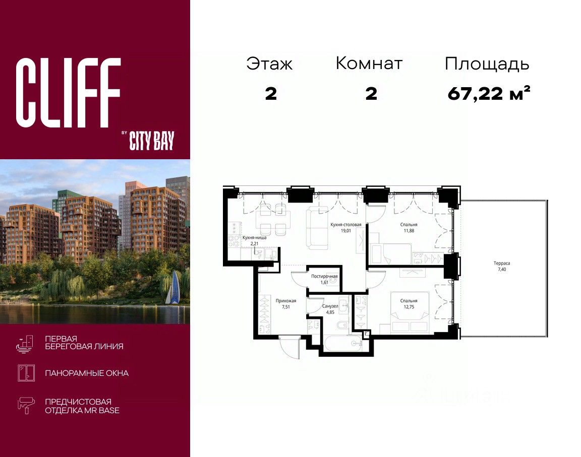 Продаётся 2-комнатная квартира общей площадью 67.22 м² с предчистовой отделкой в ЖК City Вау, квартале Cliff, на 2-м этаже 15 этажного дома.