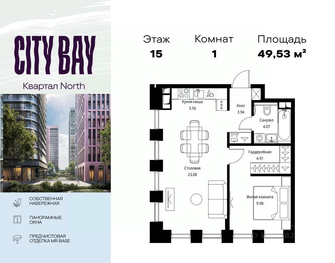 Продаётся 1-комнатная квартира общей площадью 49.53 м² с предчистовой отделкой в ЖК City Вау, квартале North, на 15-м этаже 21 этажного дома.