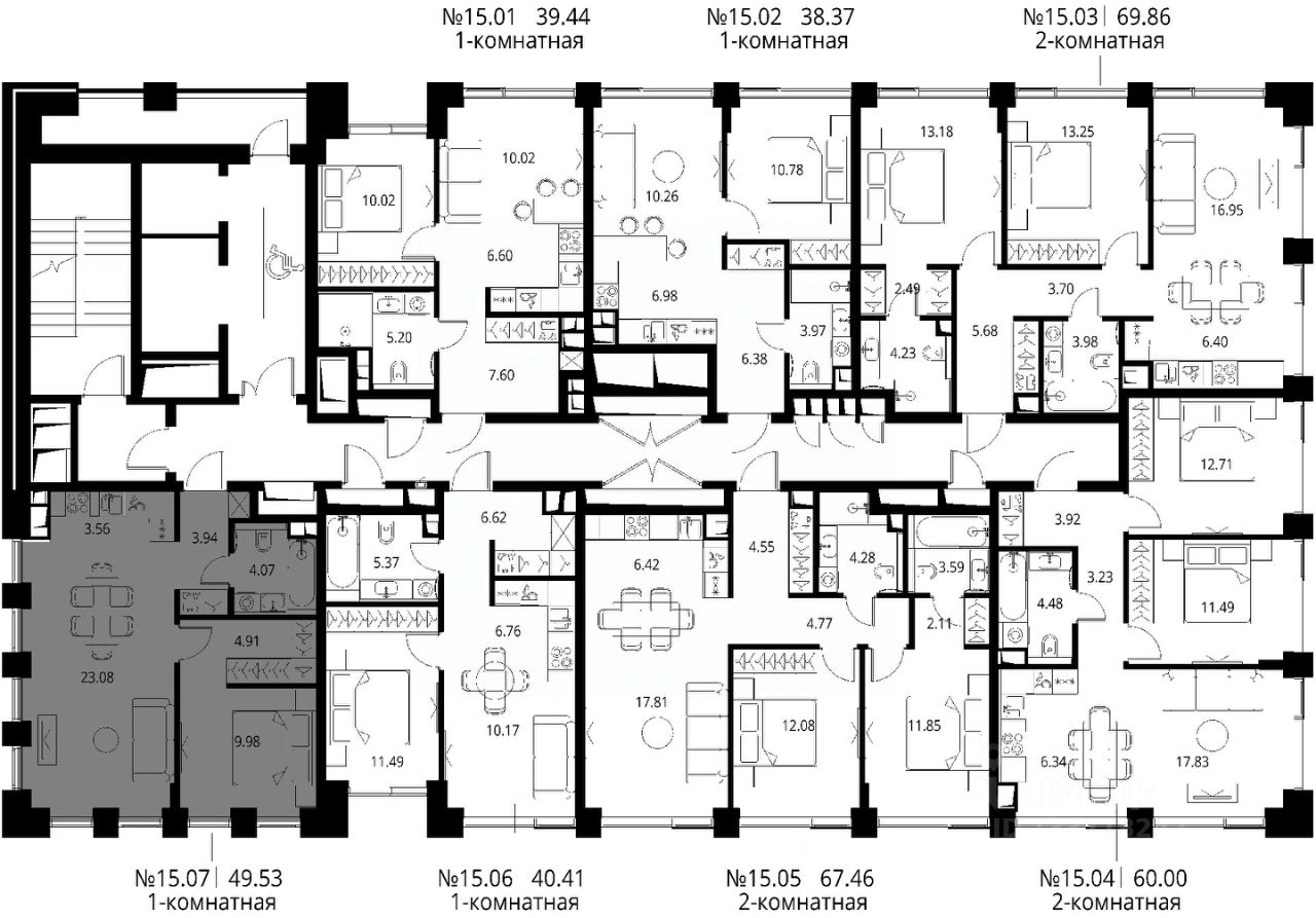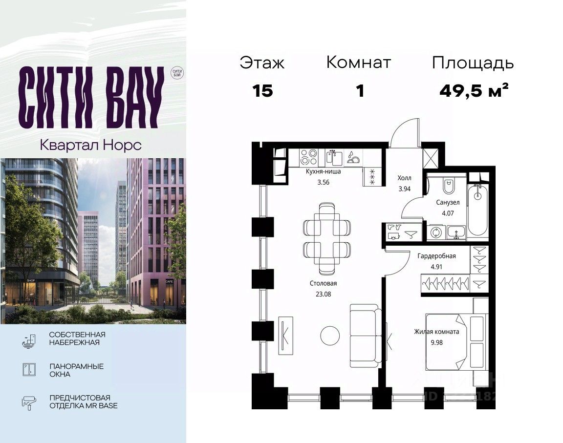 Продаётся 1-комнатная квартира общей площадью 49.53 м² с предчистовой отделкой в ЖК Сити Бэй, квартале Норс, на 15-м этаже 21 этажного дома.