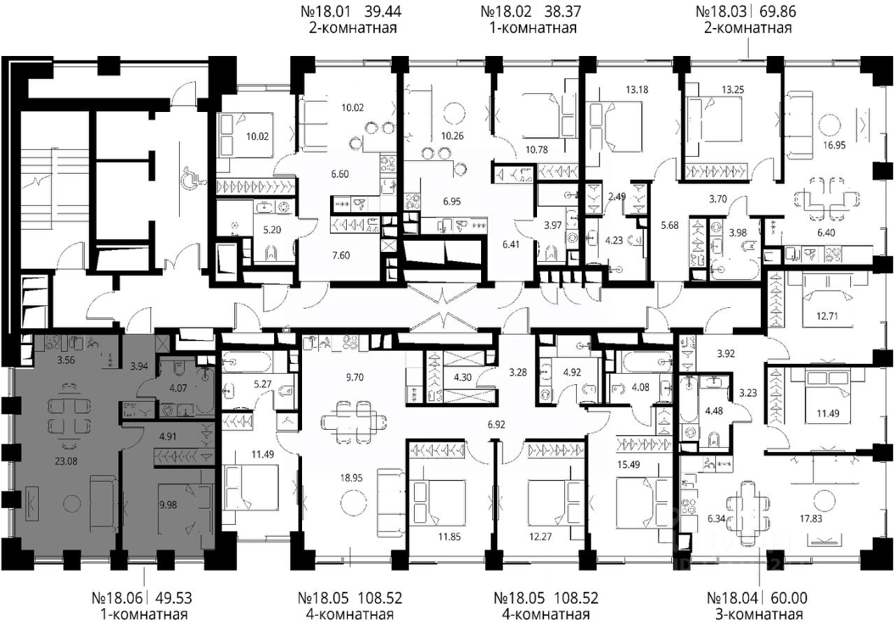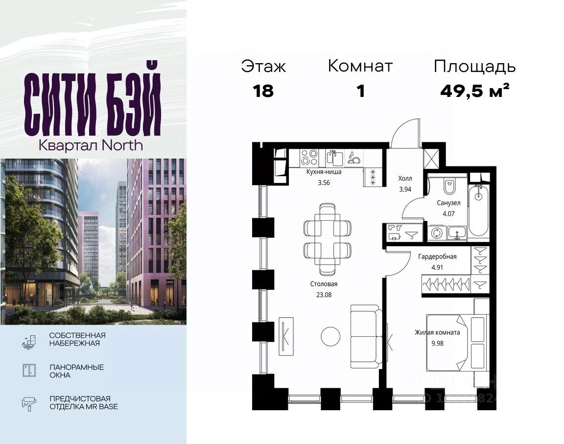 Продаётся 1-комнатная квартира общей площадью 49.53 м² с предчистовой отделкой в ЖК Сити Бэй, квартале Норс, на 18-м этаже 21 этажного дома.
