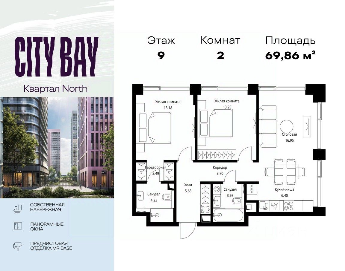 Продаётся 2-комнатная квартира общей площадью 69.86 м² с предчистовой отделкой в ЖК City Вау, квартале North, на 9-м этаже 21 этажного дома.