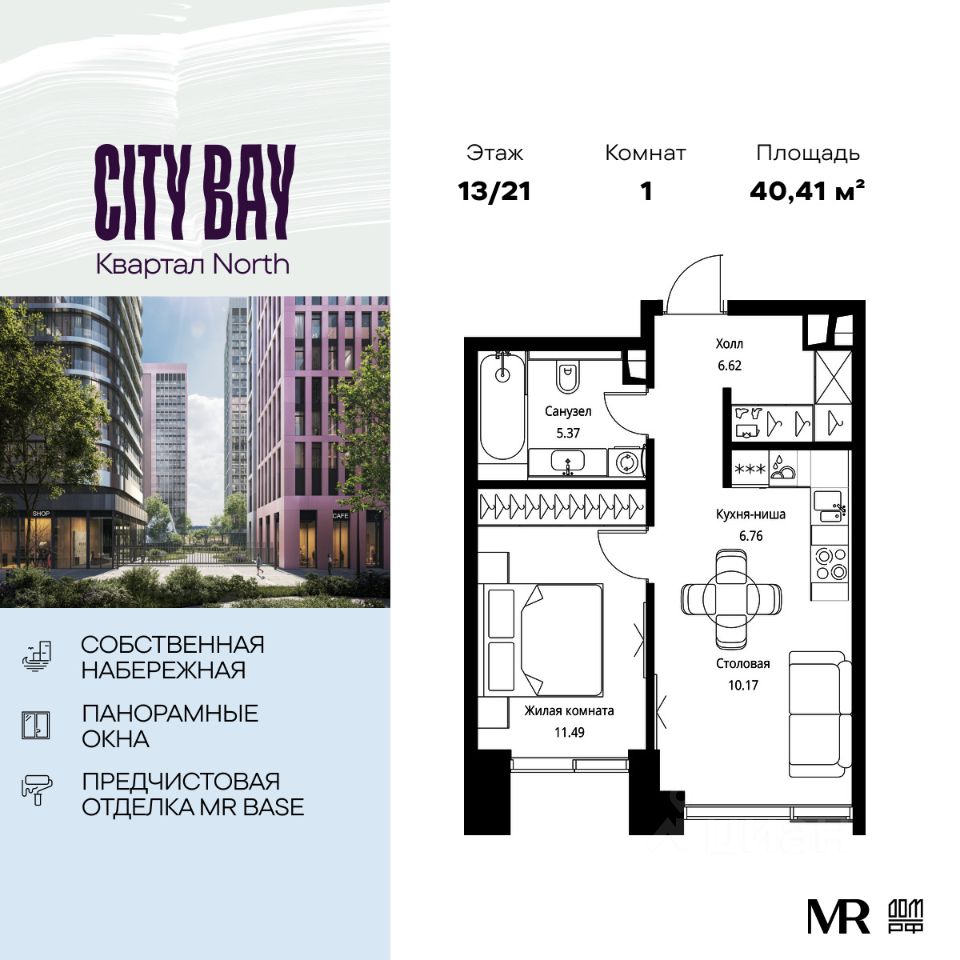 Продаётся 1-к квартира общей площадью 40.41 м² с предчистовой отделкой в ЖК City Вау, квартале North, на 13-м этаже 21 этажного дома.