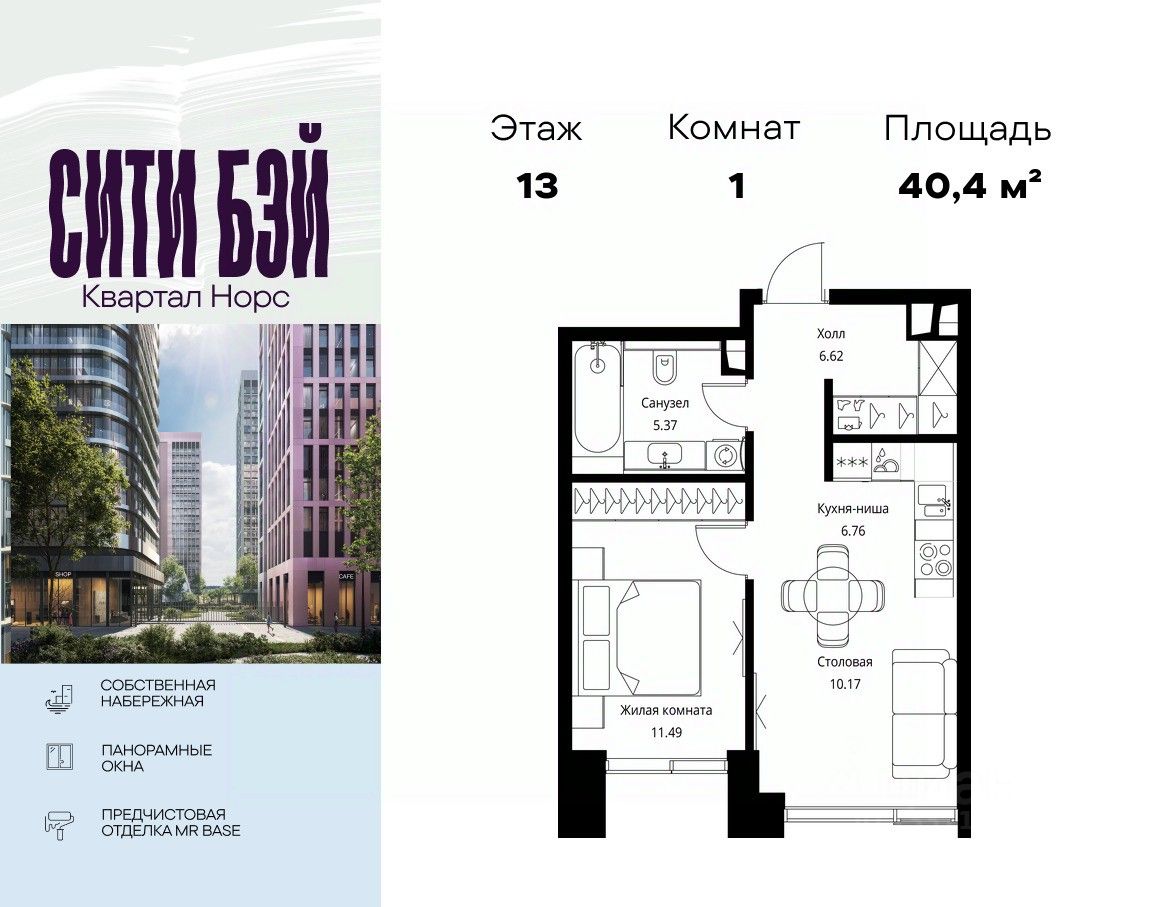 Продаётся 1-комнатная квартира общей площадью 40.41 м² с предчистовой отделкой в ЖК Сити Бэй, квартале Норс, на 13-м этаже 21 этажного дома.