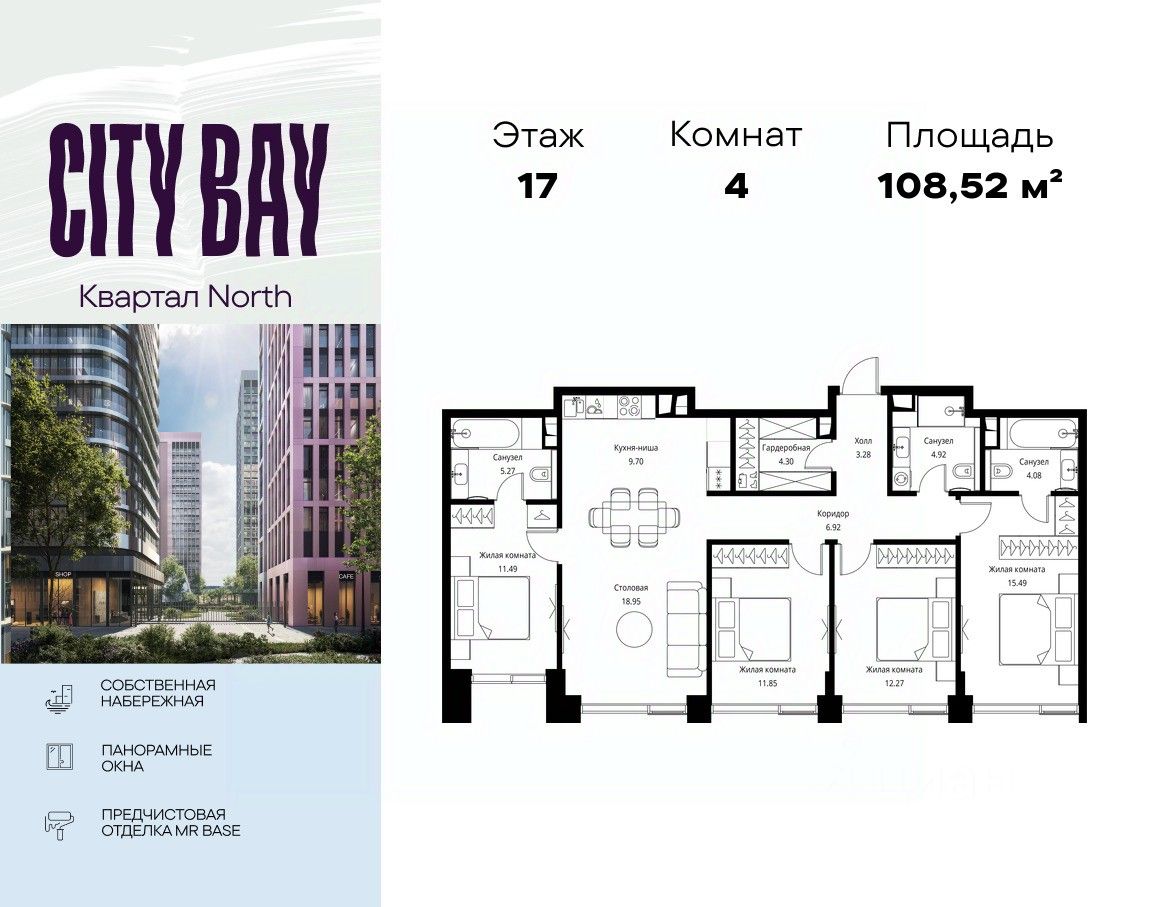 Продаётся 4-комнатная квартира общей площадью 108.52 м² с предчистовой отделкой в ЖК City Вау, квартале North, на 17-м этаже 21 этажного дома.