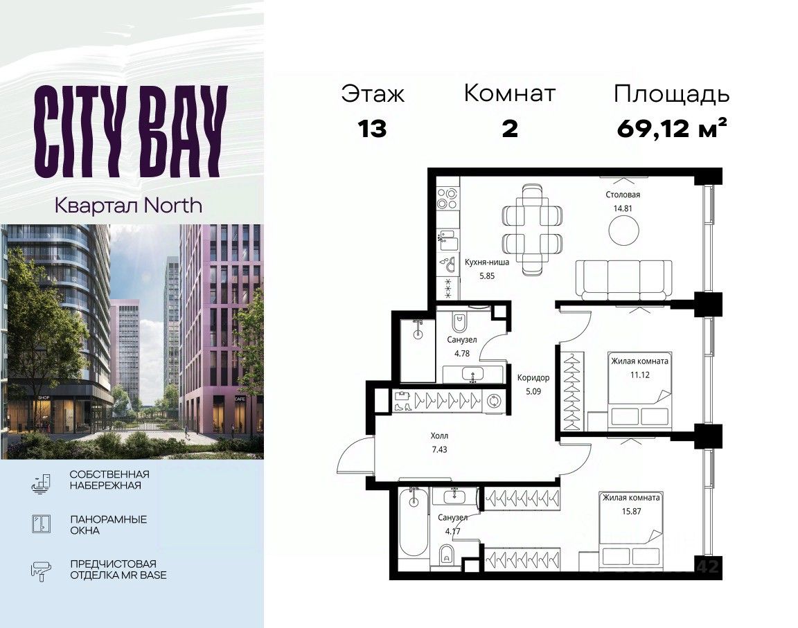 Продаётся 2-комнатная квартира общей площадью 69.12 м² с предчистовой отделкой в ЖК City Вау, квартале North, на 13-м этаже 27 этажного дома.