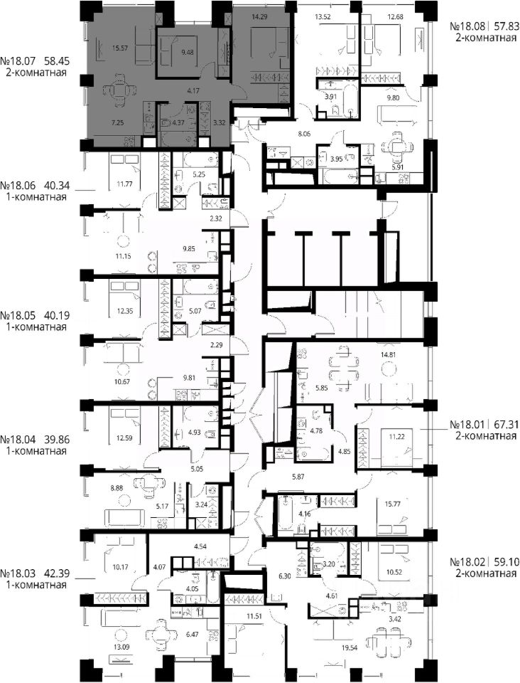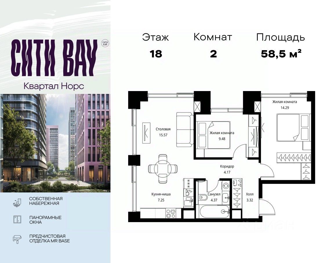 Продаётся 2-комнатная квартира общей площадью 58.45 м² с предчистовой отделкой в ЖК Сити Бэй, квартале Норс, на 18-м этаже 27 этажного дома.