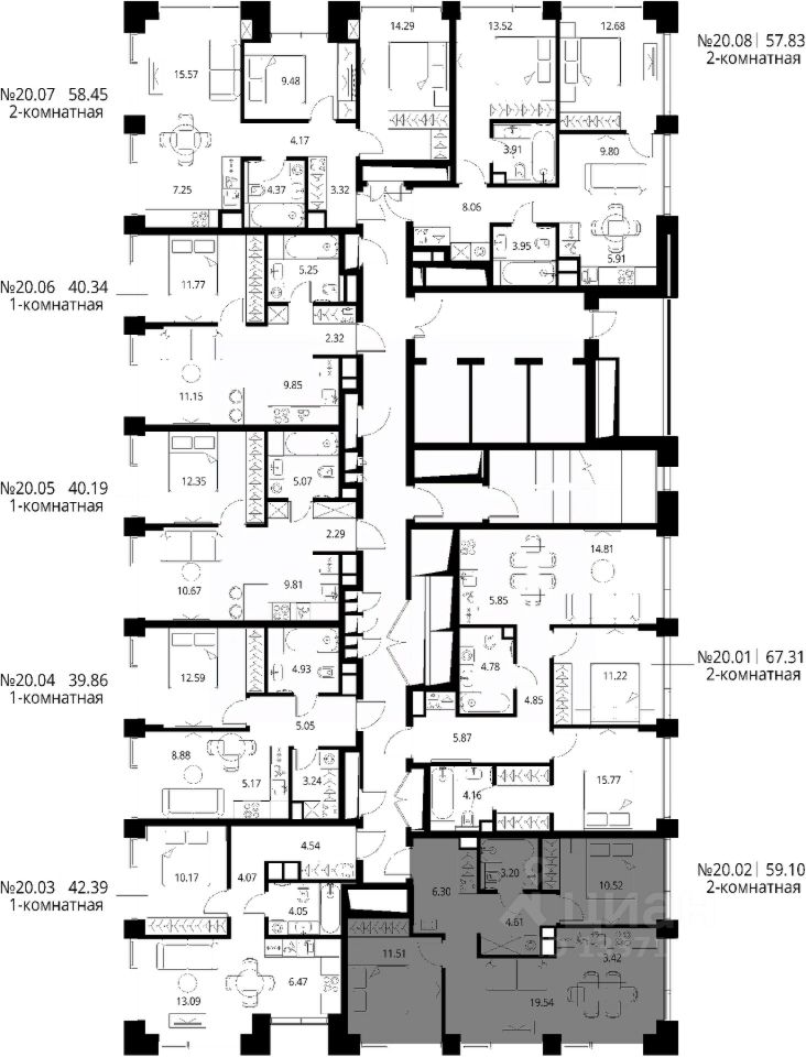 Продаётся 2-комнатная квартира общей площадью 59.10 м² с предчистовой отделкой в ЖК Сити Бэй, квартале Норс, на 20-м этаже 27 этажного дома.