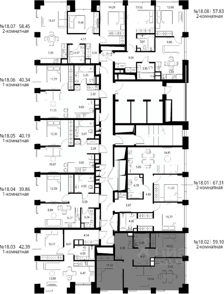 Продаётся 2-комнатная квартира общей площадью 59.10 м² с предчистовой отделкой в ЖК Сити Бэй, квартале Норс, на 18-м этаже 27 этажного дома.