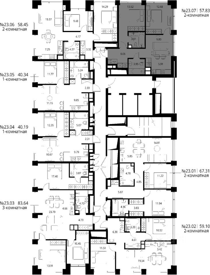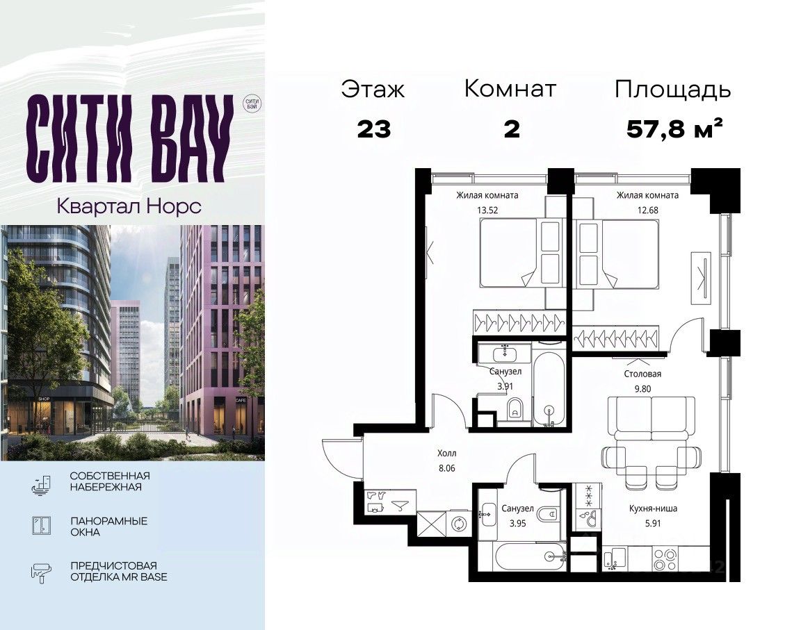 Продаётся 2-комнатная квартира общей площадью 57.83 м² с предчистовой отделкой в ЖК Сити Бэй, квартале Норс, на 23-м этаже 27 этажного дома.