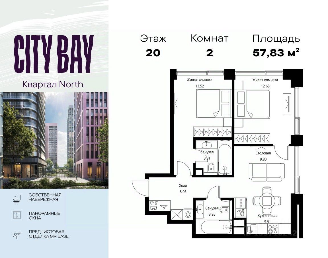 Продаётся 2-комнатная квартира общей площадью 57.83 м² с предчистовой отделкой в ЖК City Вау, квартале North, на 20-м этаже 27 этажного дома.