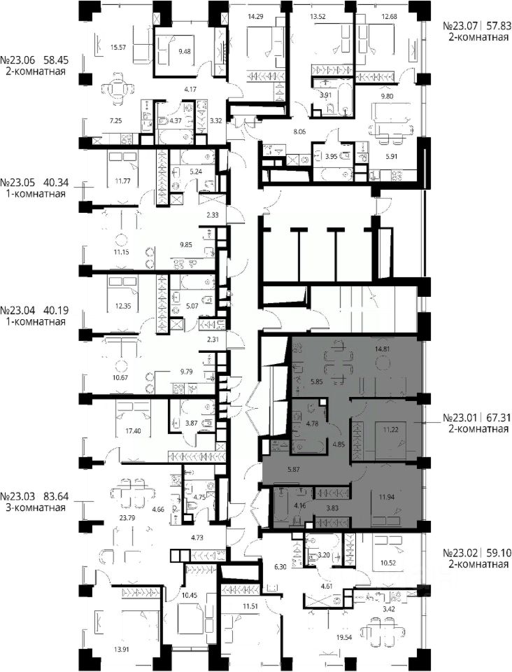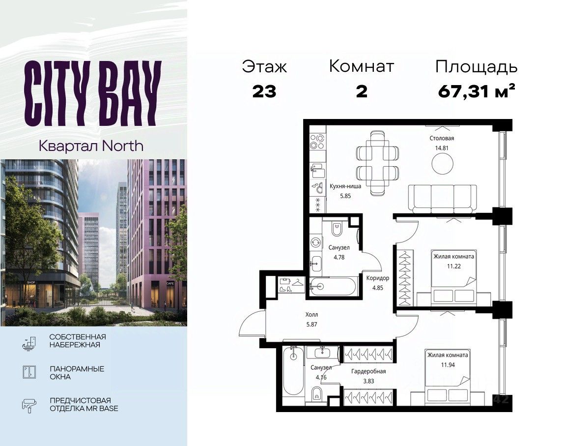 Продаётся 2-комнатная квартира общей площадью 67.31 м² с предчистовой отделкой в ЖК City Вау, квартале North, на 23-м этаже 27 этажного дома.