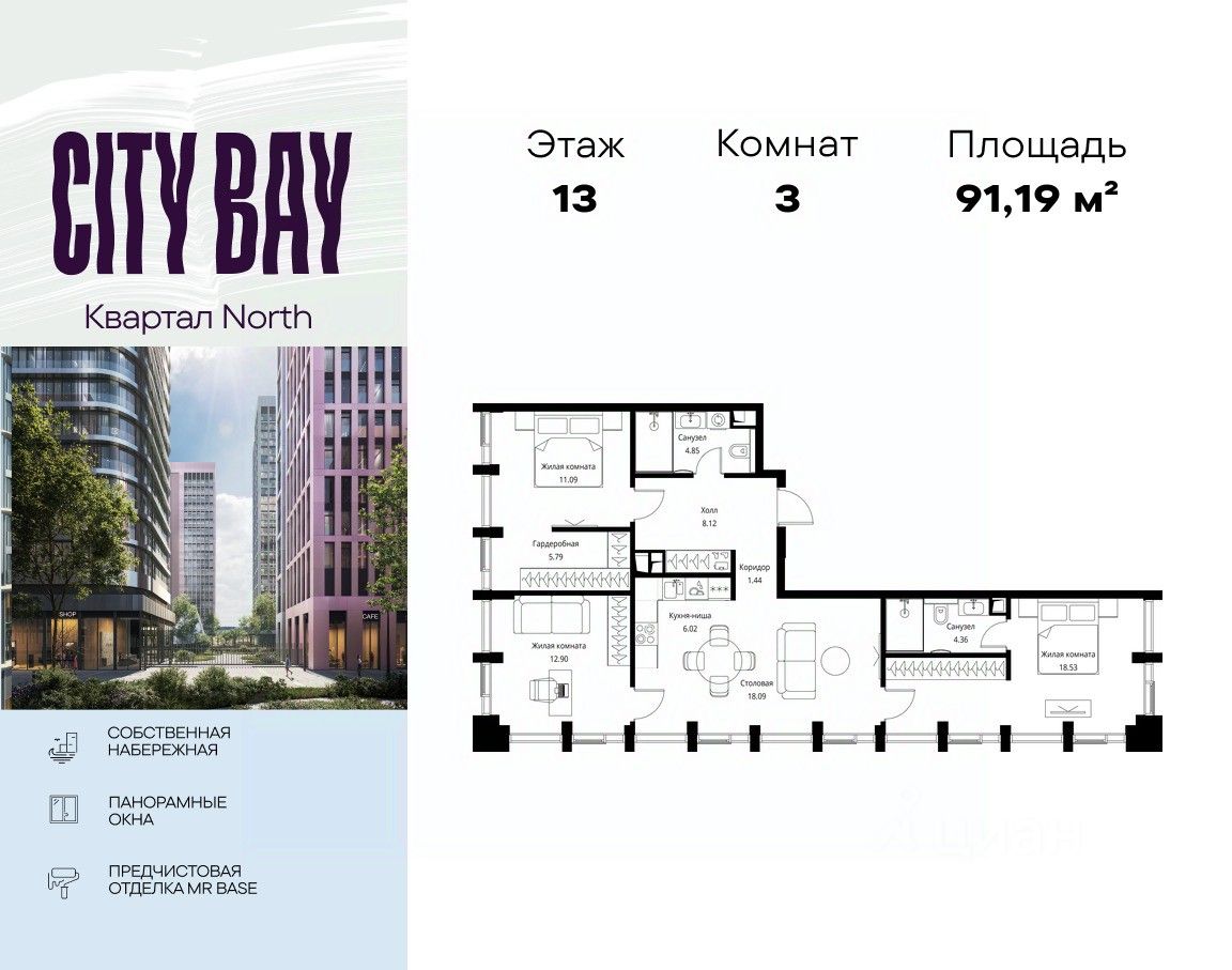 Продаётся 3-комнатная квартира общей площадью 91.19 м² с предчистовой отделкой в ЖК City Вау, квартале North, на 13-м этаже 19 этажного дома.