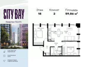 Продаётся 2-комнатная квартира общей площадью 59.86 м² с предчистовой отделкой в ЖК City Вау, квартале North, на 18-м этаже 19 этажного дома.