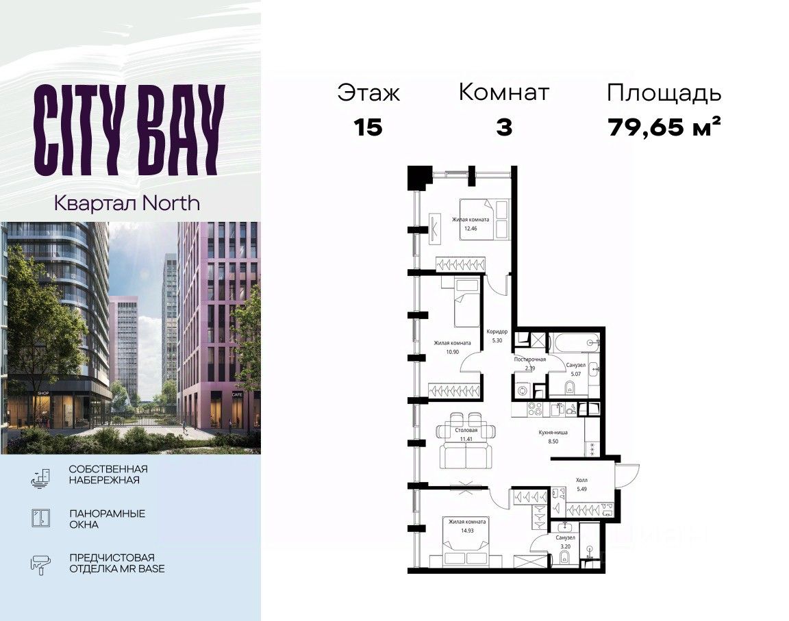 Продаётся 3-комнатная квартира общей площадью 79.65 м² с предчистовой отделкой в ЖК City Вау, квартале North, на 15-м этаже 19 этажного дома.