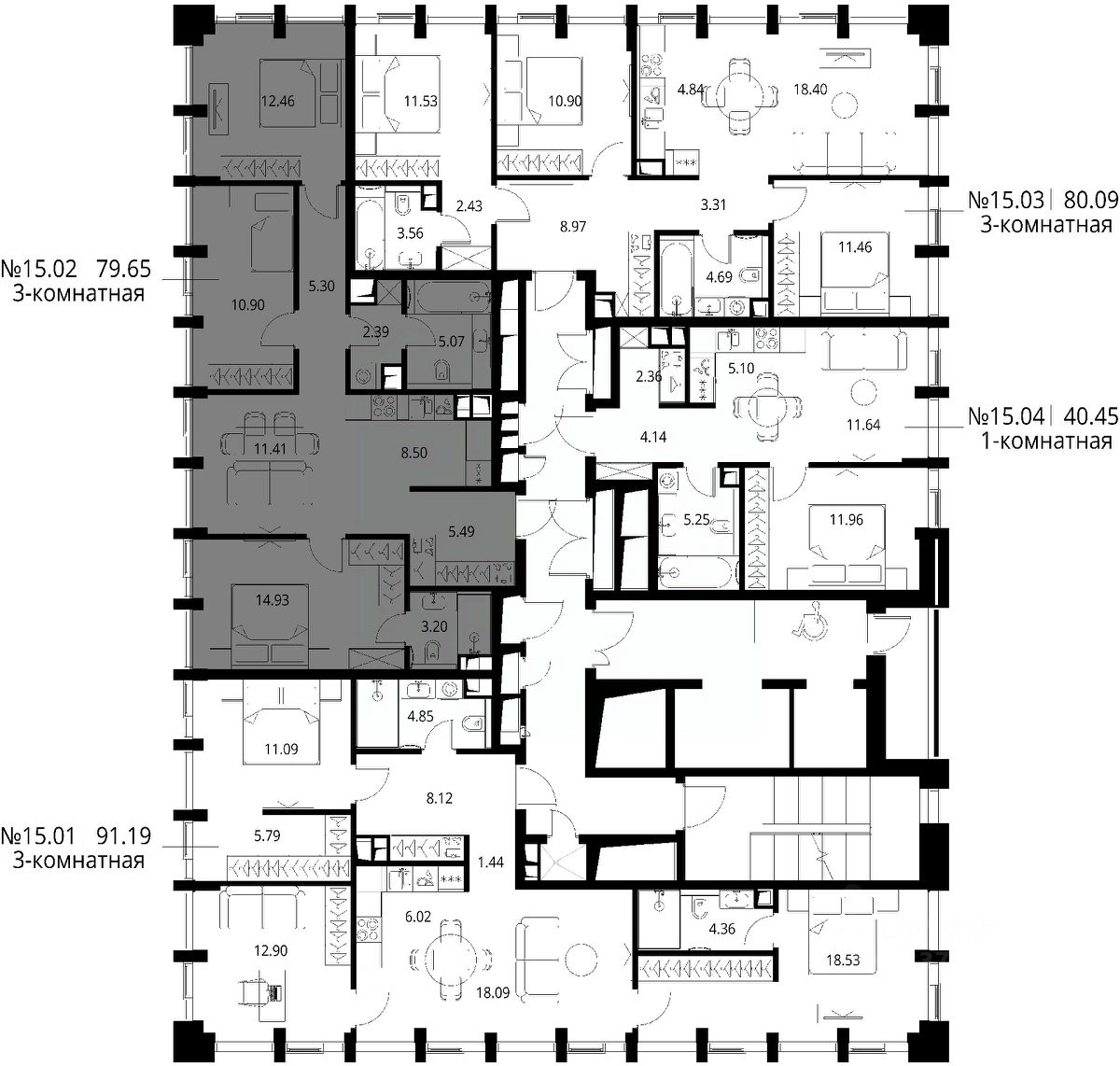Продаётся 3-комнатная квартира общей площадью 79.65 м² с предчистовой отделкой в ЖК Сити Бэй, квартале Норс, на 15-м этаже 19 этажного дома.