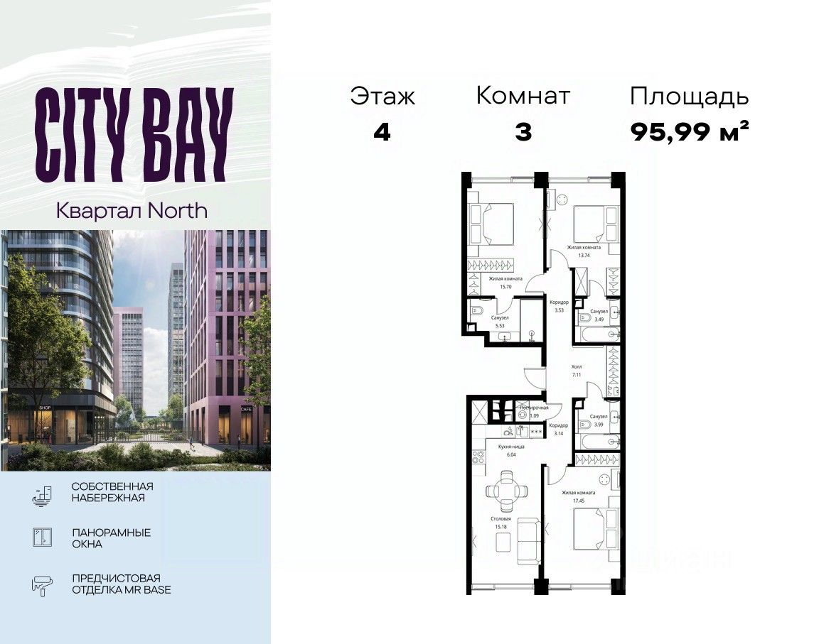 Продаётся 3-комнатная квартира общей площадью 95.99 м² с предчистовой отделкой в ЖК City Вау, квартале North, на 4-м этаже 10 этажного дома.