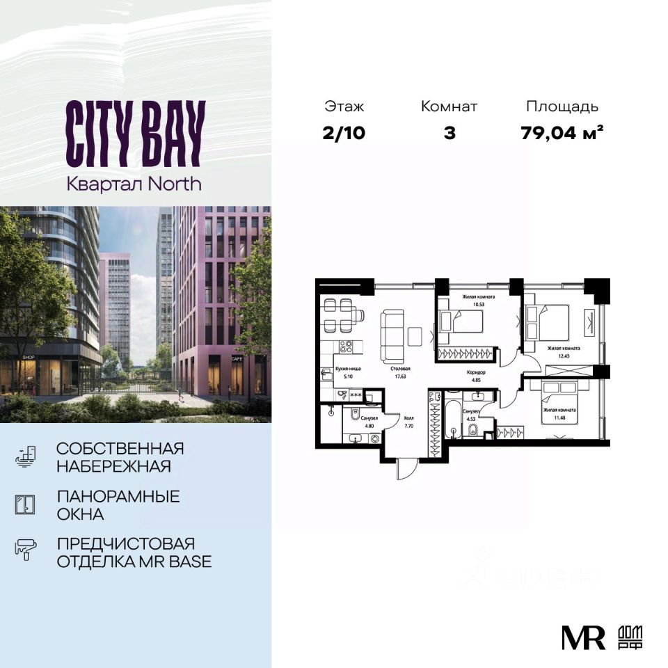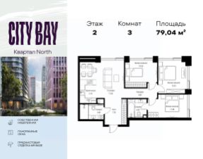 Продаётся 3-комнатная квартира общей площадью 79.04 м² с предчистовой отделкой в ЖК City Вау, квартале North, на 2-м этаже 10 этажного дома.